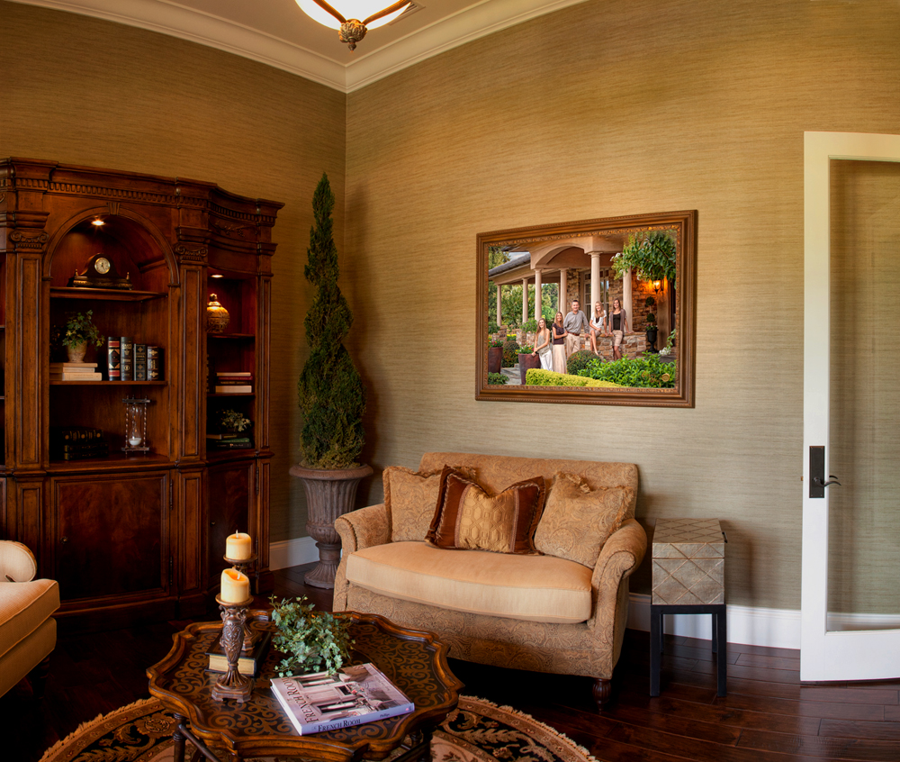 In the design process of Tiffany and John Donovan's family portrait, an inquiry surfaced about the potential of photographing on location at their home. Naturally we took a visit, and discovered, as you can see, that their home is just beautiful! Of course it would be stunning showcased in a portrait. The Donovans prompted the "on location" idea simply due to the fact that they thought it may mean a little something extra if their family's home, build by John himself, was showcased in their portrait. We absolutely agreed and quickly worked out the rest of the details from there. Being that we were already at their home, we were able to see first hand where their piece of art would eventually hang.