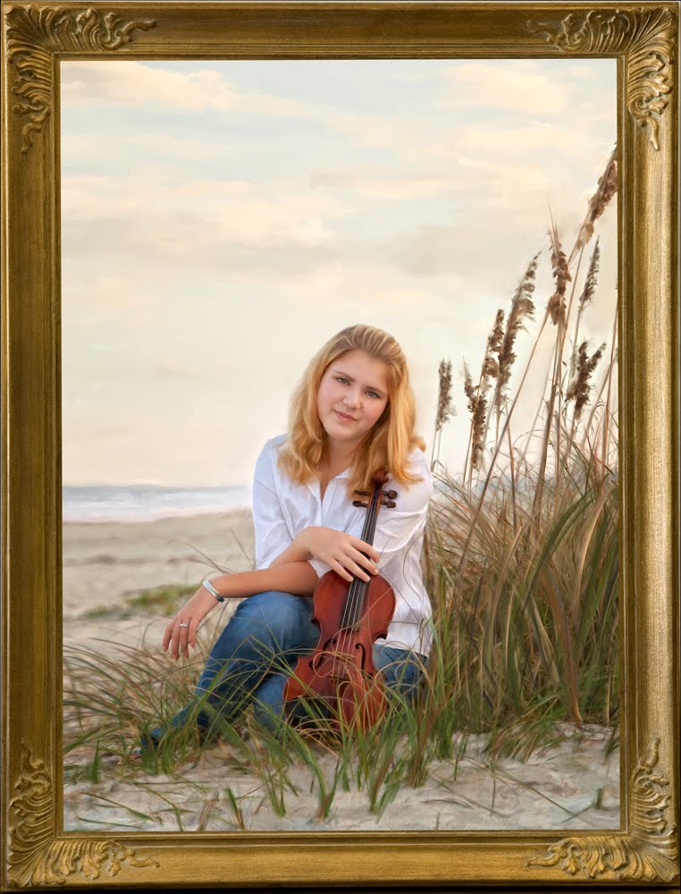 I just love to be to able to give you a glimpse into our camera studies here at the gallery and on location. Being that I am not only an artist, but a true lover of art, I know how relieving it is to be able to see beyond the façade of a portrait created by an artist whom I admire. Since you all are loyal readers, a little bit of insight seems fitting for you too. The subject of this portrait is Kaley Stirtzinger, who is the daughter of Todd and Karen Stirtzinger. Lesa and I have so many great things to say about this beautiful young lady. As is evident by the sweet expression on her face, she has such a lovely spirit and was more than happy to work with us as we created this beautiful image. Besides her sweet personality, this girl is an avid reader- a book connoisseur if you will, a focused student, and as showcased in the image, a wonderful violinist. We can only thank Kaley and her loving parents for the opportunity to create such a beautiful piece of art.